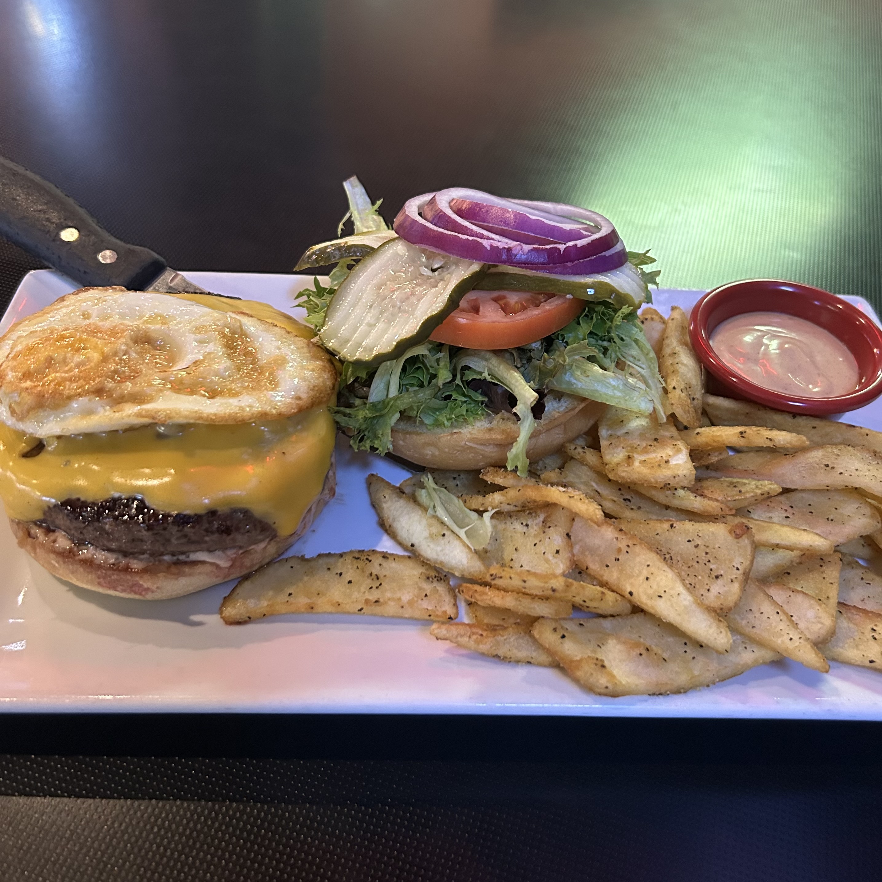 American cheese, 1000 island, fried egg, lettuce, tomatoes, onions and pickles.