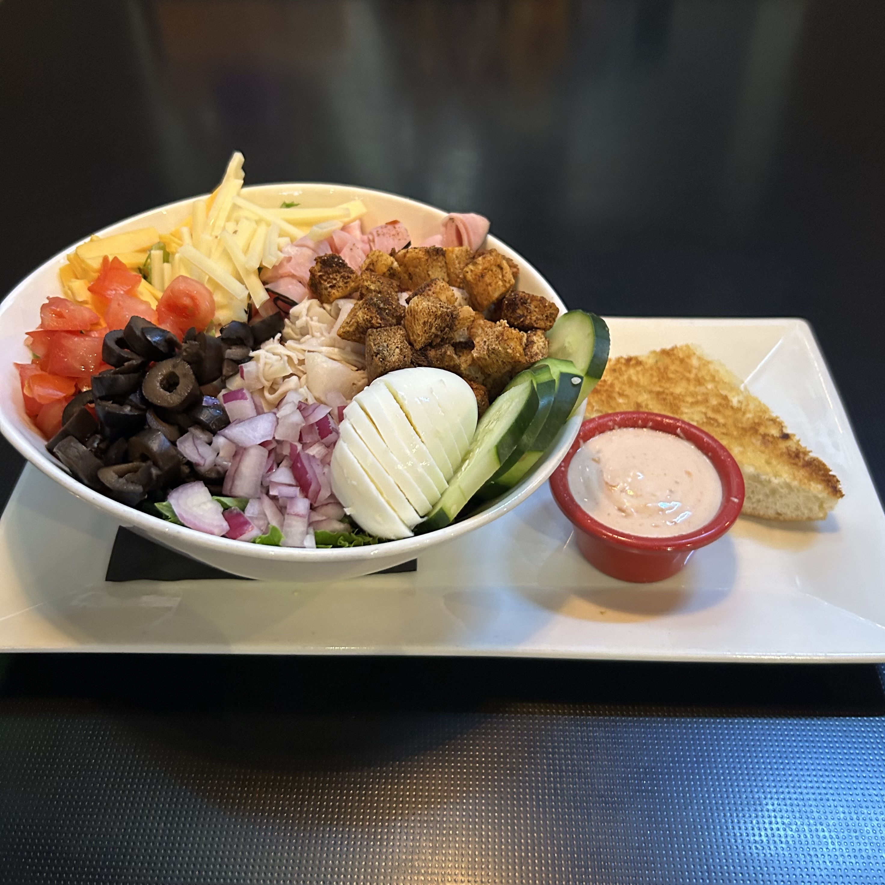 Mixed greens, ham, turkey, Swiss cheese, cheddar cheese, tomatoes, olives, red onions, cucumber, hard boiled egg and croutons. Served with choice of dressing.