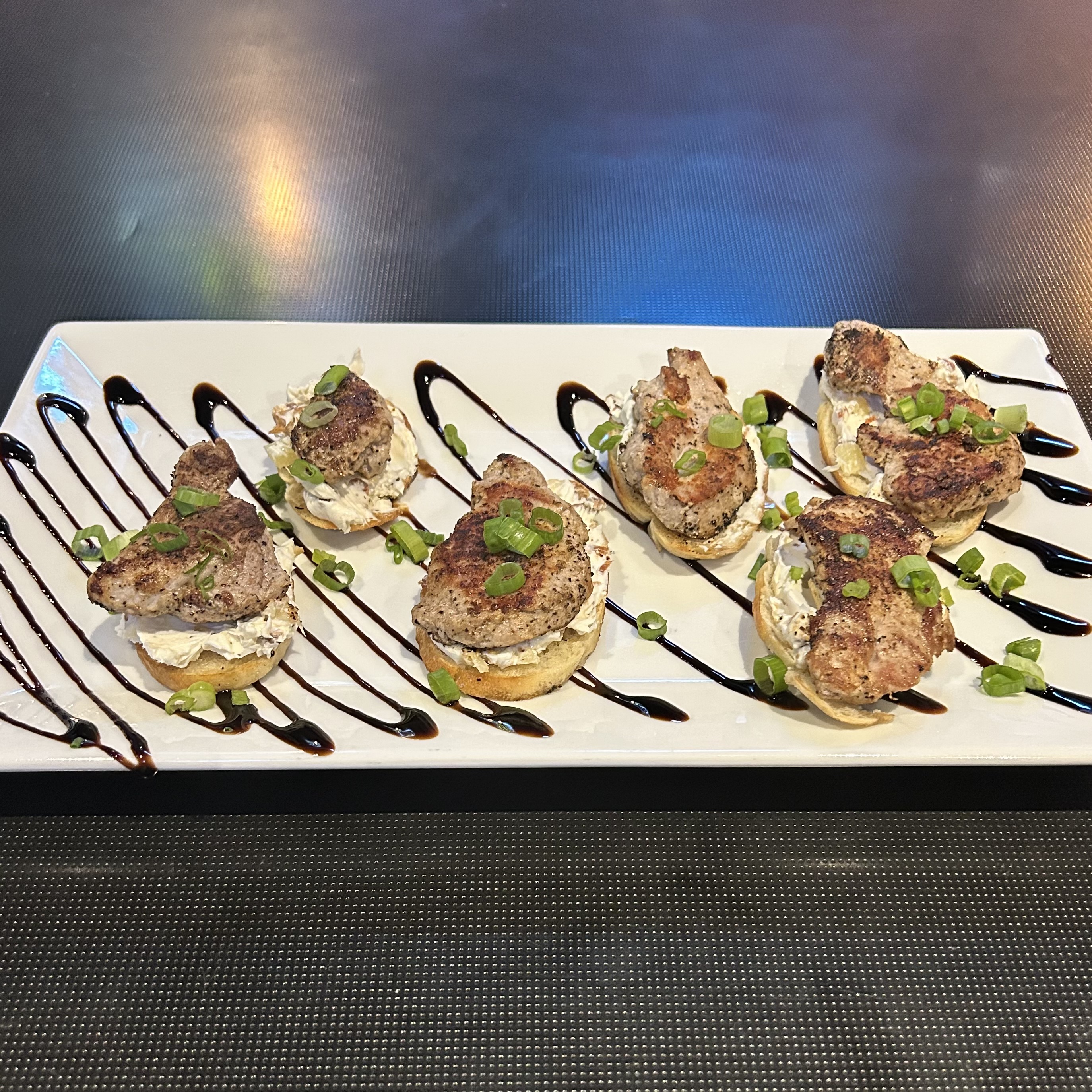 Crostinis topped with pork tenderloin, pineapple bacon cream cheese spread, drizzled with balsamic reduction, and topped with green onions.