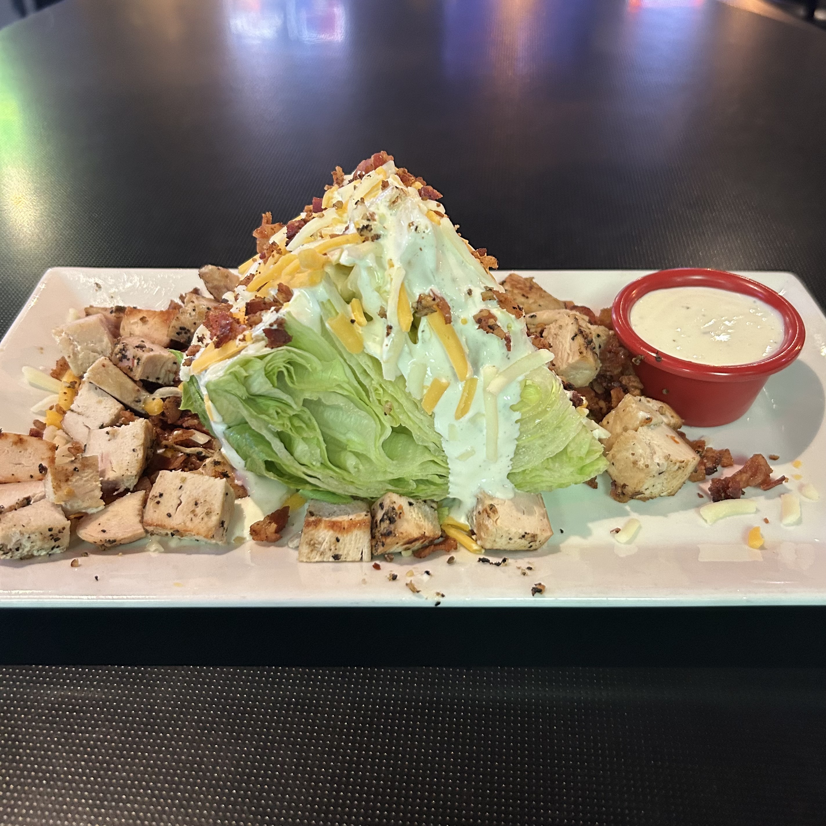 Wedged Iceburg lettuce topped with blue cheese dressing, bacon, tomatoes, marinated red onion and smoked Rogue Creamery blue cheese.