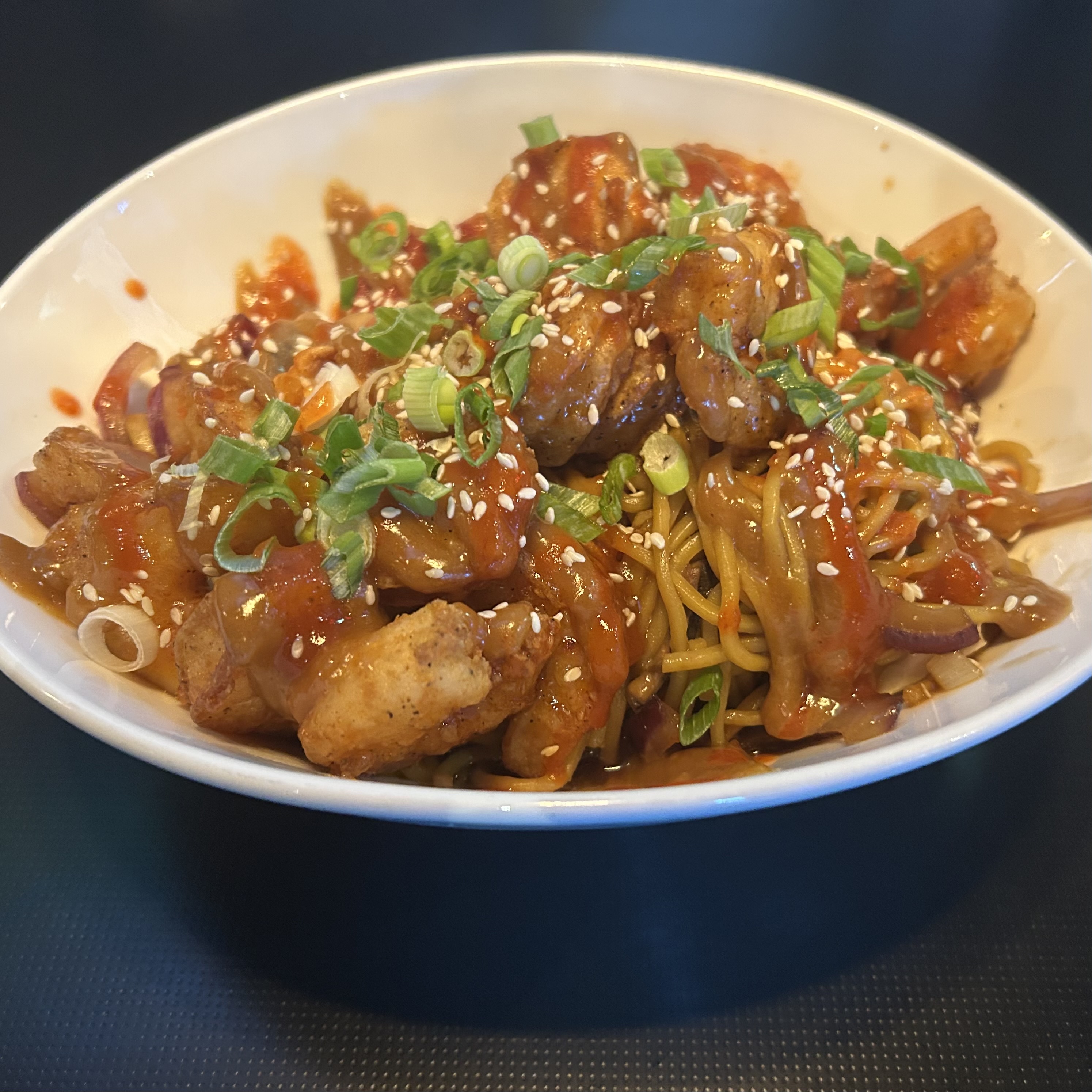 Teriyaki Yakisoba noodles mixed with bell peppers, mushrooms, onions, Sriracha, cabbage, Thai peanut sauce, green onions and sesame seeds. Topped with grilled chicken or hot honey shrimp.