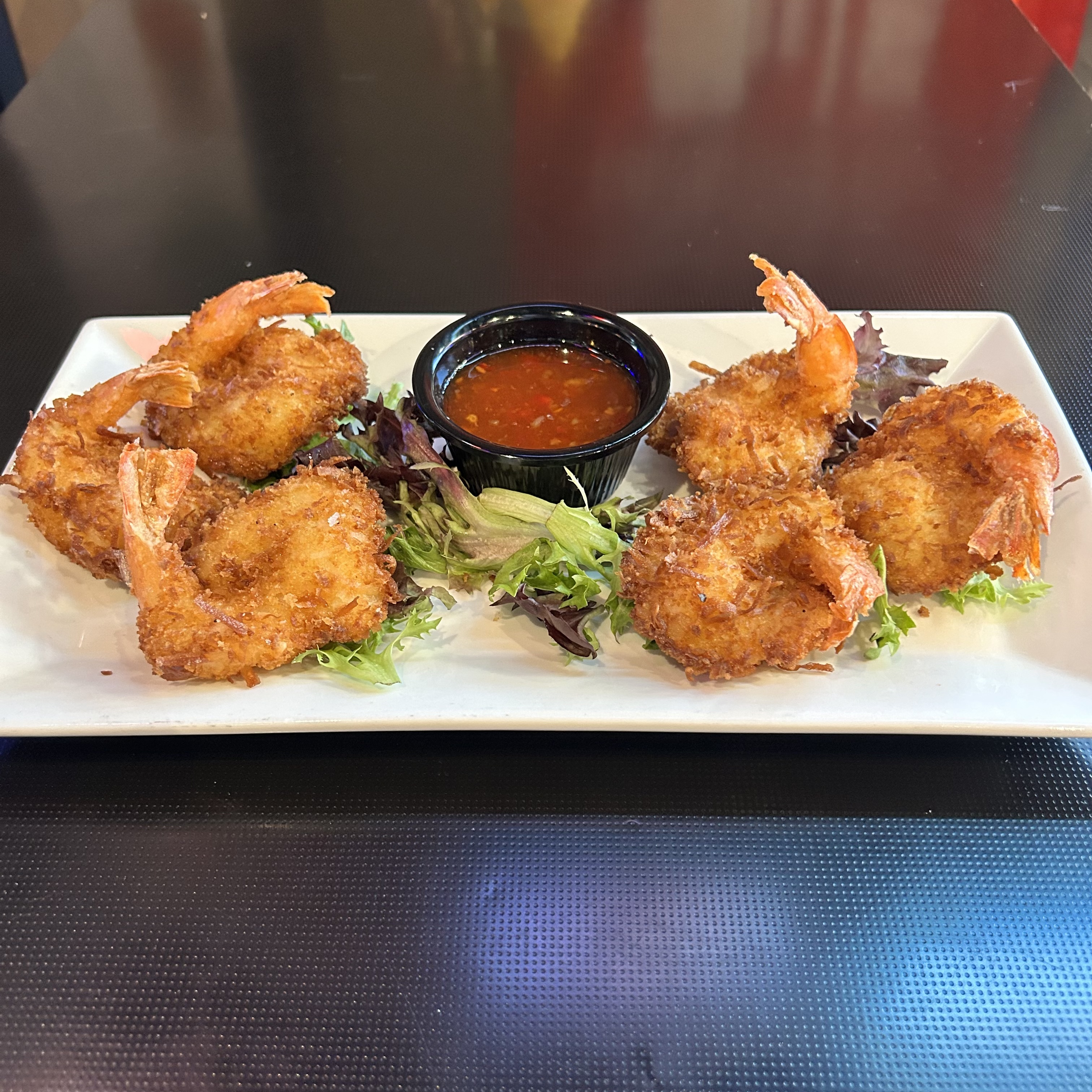 Large shrimp hand breaded and tossed with shredded coconut. Served with sweet chili sauce.