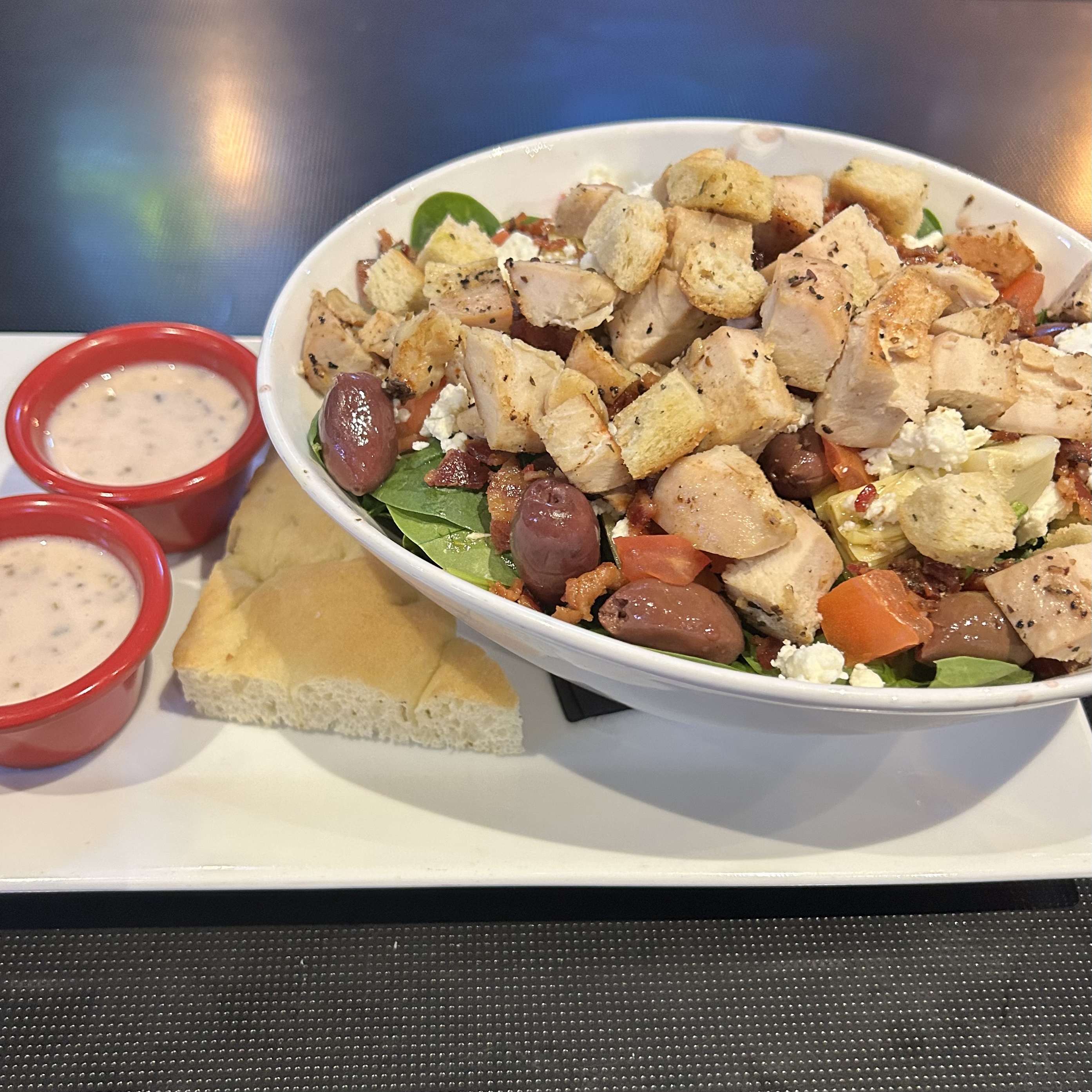 Half Mixed greens, grilled chicken breast, cucumbers, tomatoes, pepper bacon, sliced avocado, red onion, black olives, hard boiled eggs, blue cheese crumbles and croutons. Served with choice of dressing.