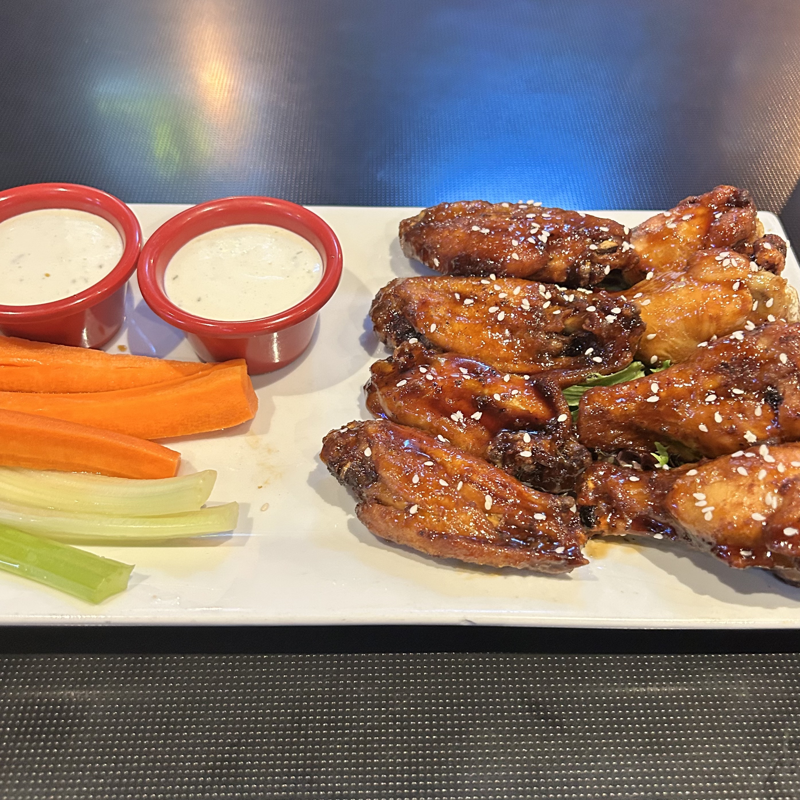 Bone-in chicken wings. Tossed with your choice of sweet chili, buffalo, teriyaki, Thai peanut sauce, hot honey sauce, or BBQ sauce. Boneless wings available upon request